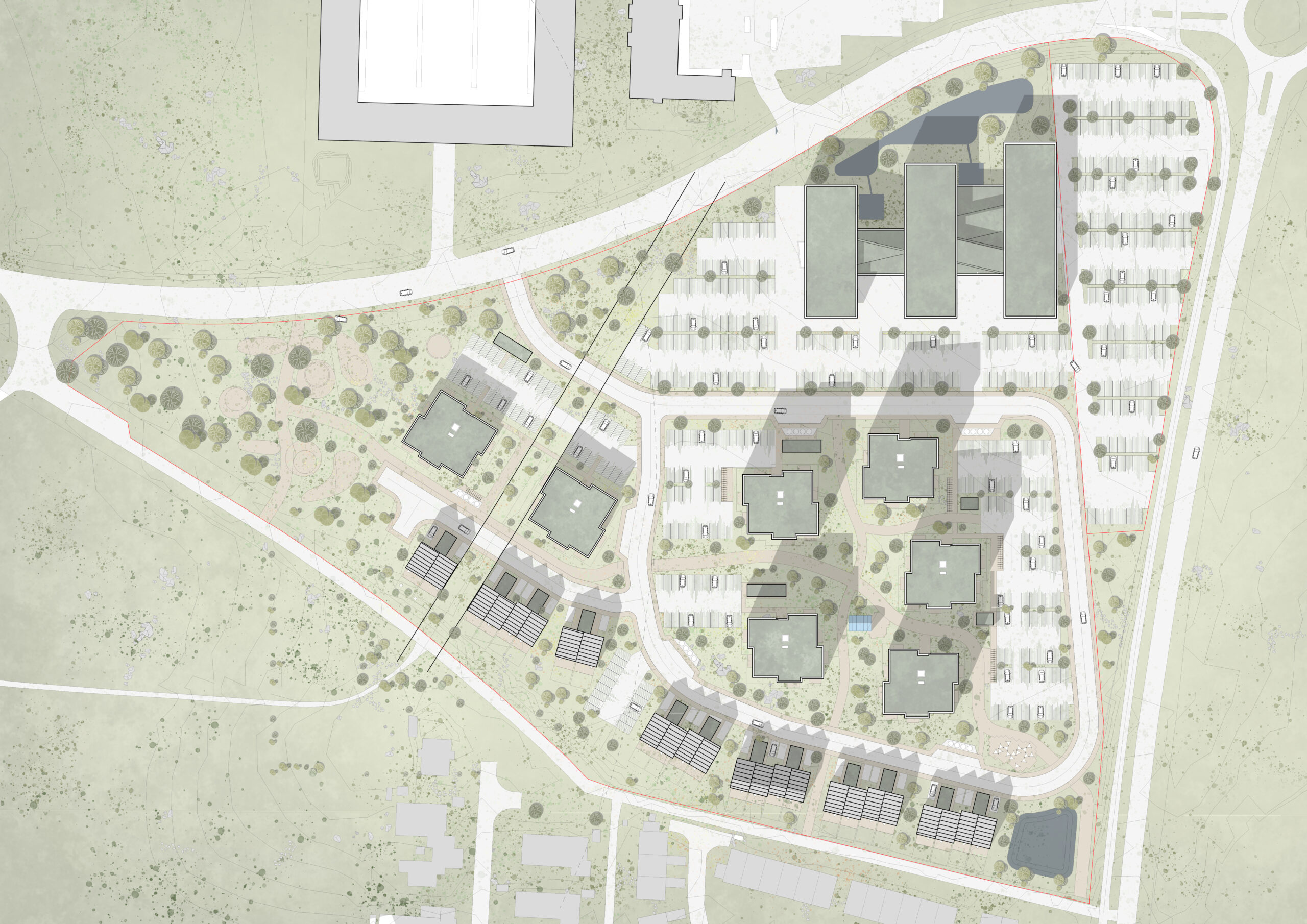 Bebyggelsen placeres i landskabet med omtanke, og bygningernes materialevalg og formsprog henter inspiration i både det nordiske og det historiske. Grønne fællesarealer, stiforbindelser og små pladser binder området sammen og skaber mulighed for møder og fællesskab mellem beboere.