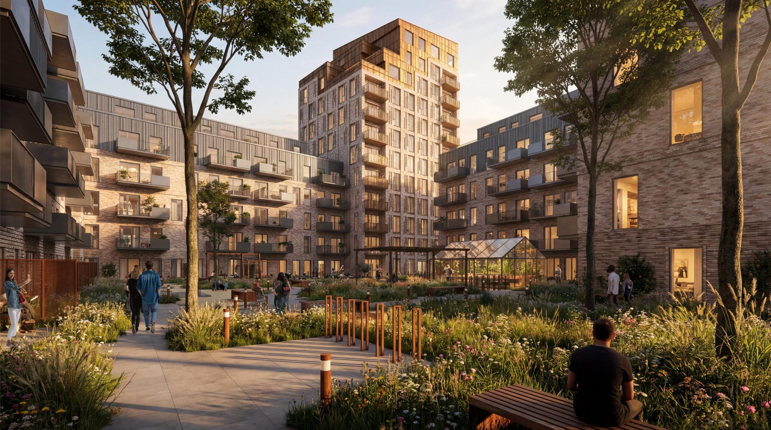 Gårdrummene skal fungere som karrens hjerte og være omdrejningspunktet for hele bebyggelsen. Hvilke skal sikre identitet og fællesskab i bebyggelsen. I gårdrummets centrale del udlægges et stort sammenhængende område grønt område med grønne flader, bede, stier og fælleshus/orangeri, grillpladser og små pavilloner. Beplantningen vil være varieret med blomster, prydgræsser, kombineret med stedsegrønne buske og træer som ex bjergfyr o.a., der kan suppleres med duftende blomster og frugtbærende træer som ex sommerfuglebuske, bærmispel og paradisæbler. Hvilket skal tiltrække fugle og insekter og sikre gode rammer for biodiversitet og dyrelivet generelt.